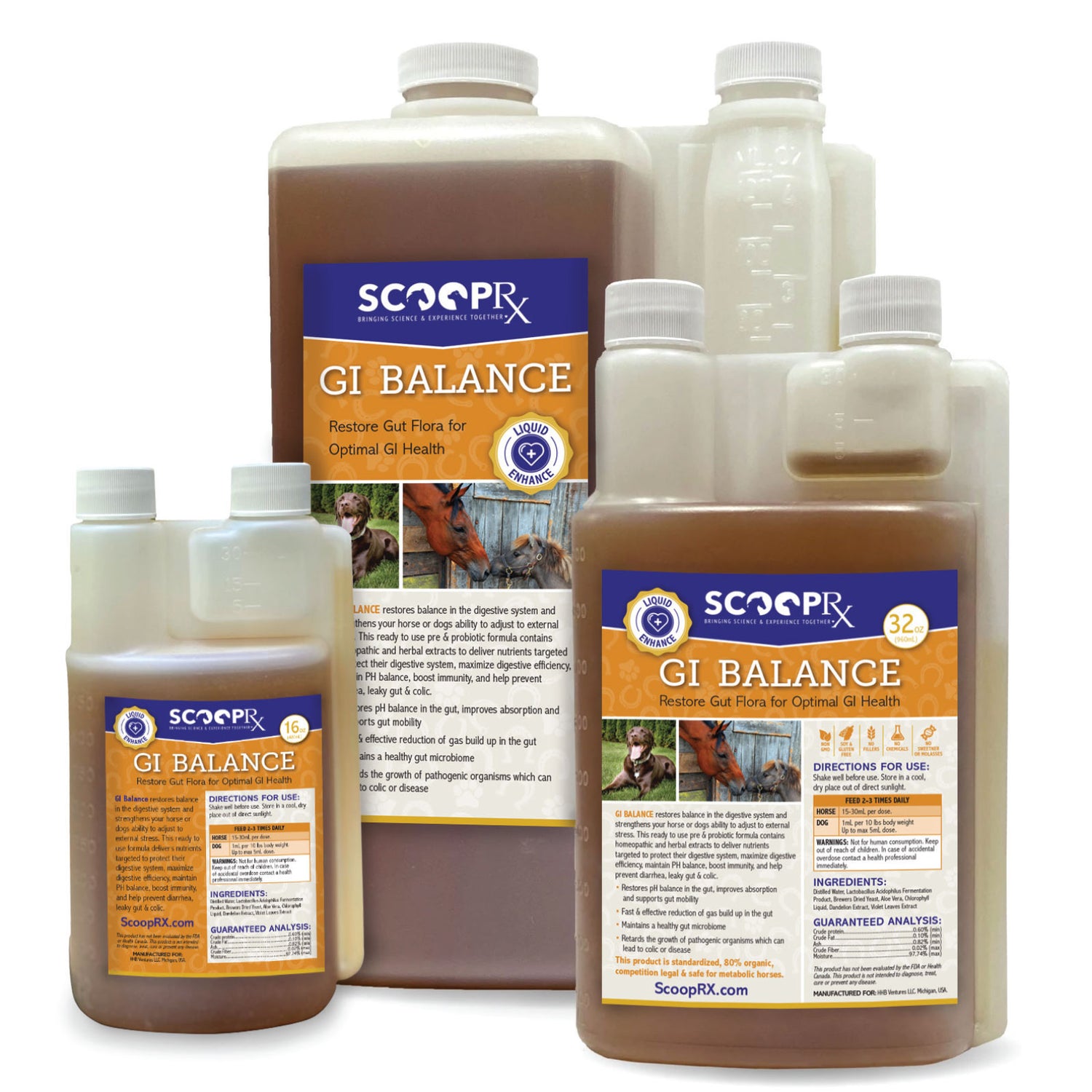 GI BALANCE is a fast-acting, palatable liquid digestive supplement designed to support horses who tend to get gas, bloating, are prone to colic, and microbial hindgut imbalance. For daily use or as-needed gut support. Also safe for dogs (see dosing guidelines).